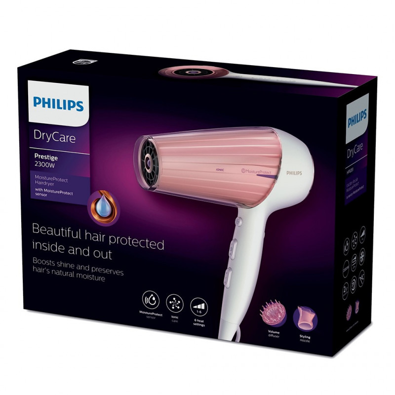 La technologie MoistureProtect contrôle et adapte la température afin de préserver l'hydratation naturelle de vos cheveux. Elle évite que vos cheveux ne surchauffent en maintenant en permanence une température optimale, pour de magnifiques cheveux protégés en profondeur. Le capteur infrarouge MoistureProtect surveille et adapte en permanence la température de séchage en fonction des besoins de vos cheveux. Le capteur intelligent mesure la température vos cheveux pendant que vous les séchez, afin d'éviter qu'ils ne se dessèchent ou que leurs cuticules ne s'abîment. Grâce à une hydratation préservée, vos cheveux restent plus doux, brillants et sains. Vous pouvez activer ou désactiver le capteur en fonction de vos besoins. EAN 8710103864950.