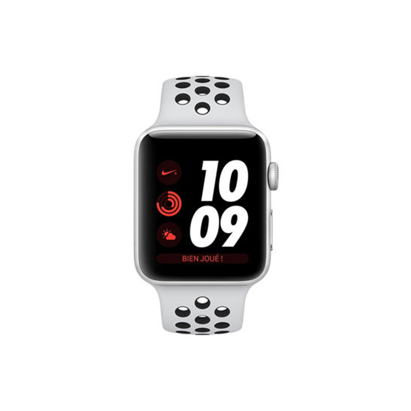 Apple Watch Nike+ Série 3 (38mm) Boîtier en aluminium argent avec Bracelet Sport Nike Platine pur/Noir (GPS) [référence Apple MQKX2]. [late 2017] [système watchOS 4] GPS et GLONASS intégrés Processeur bicoeur plus rapide Puce W2 Altimètre barométrique Capacité 8 Go Cardiofréquencemètre Accéléromètre et gyroscope Etanche jusqu'à 50 mètres Verre renforcé Ion-X Dos en composite Wi-Fi (802.11b/g/n 2,4 GHz) Bluetooth 4.2 Jusqu'à 18 heures d'autonomie (matériel neuf, garantie totale 3 ans). EAN 0190198508867.