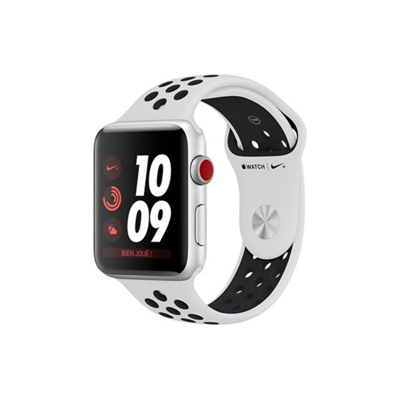 Apple Watch Nike+ Série 3 (38mm) Boîtier en aluminium argent avec Bracelet Sport Nike Platine pur/Noir (GPS + Cellular) [référence Apple MQM72]. [late 2017] [système watchOS 4] GPS et GLONASS intégrés Processeur bicoeur plus rapide Puce W2 Altimètre barométrique Capacité 16 Go Cardiofréquencemètre Accéléromètre et gyroscope Etanche jusqu'à 50 mètres Verre renforcé Ion-X Dos en composite Wi-Fi (802.11b/g/n 2,4 GHz) Bluetooth 4.2 Jusqu'à 18 heures d'autonomie (matériel neuf, garantie totale 3 ans). EAN 0190198517562.
